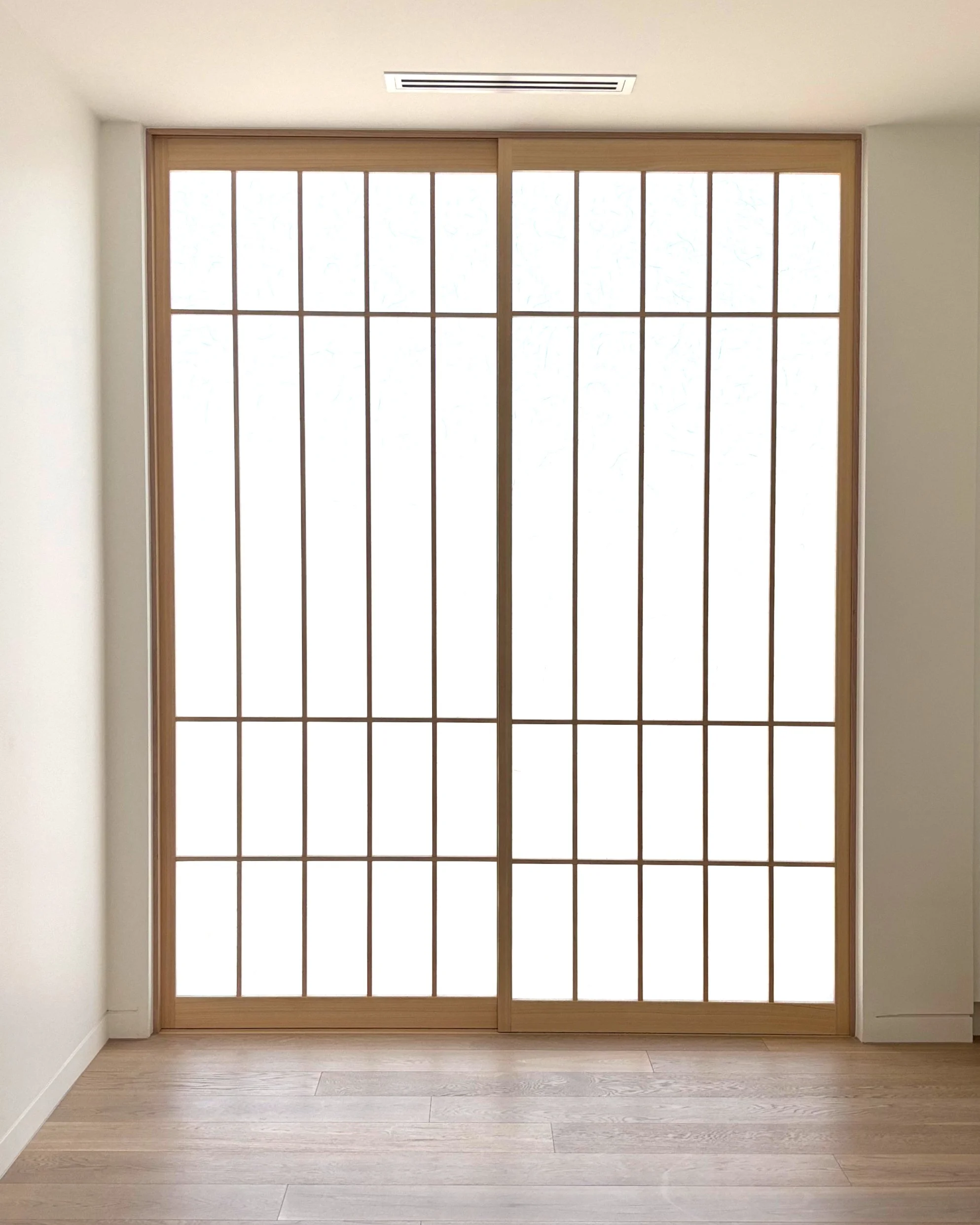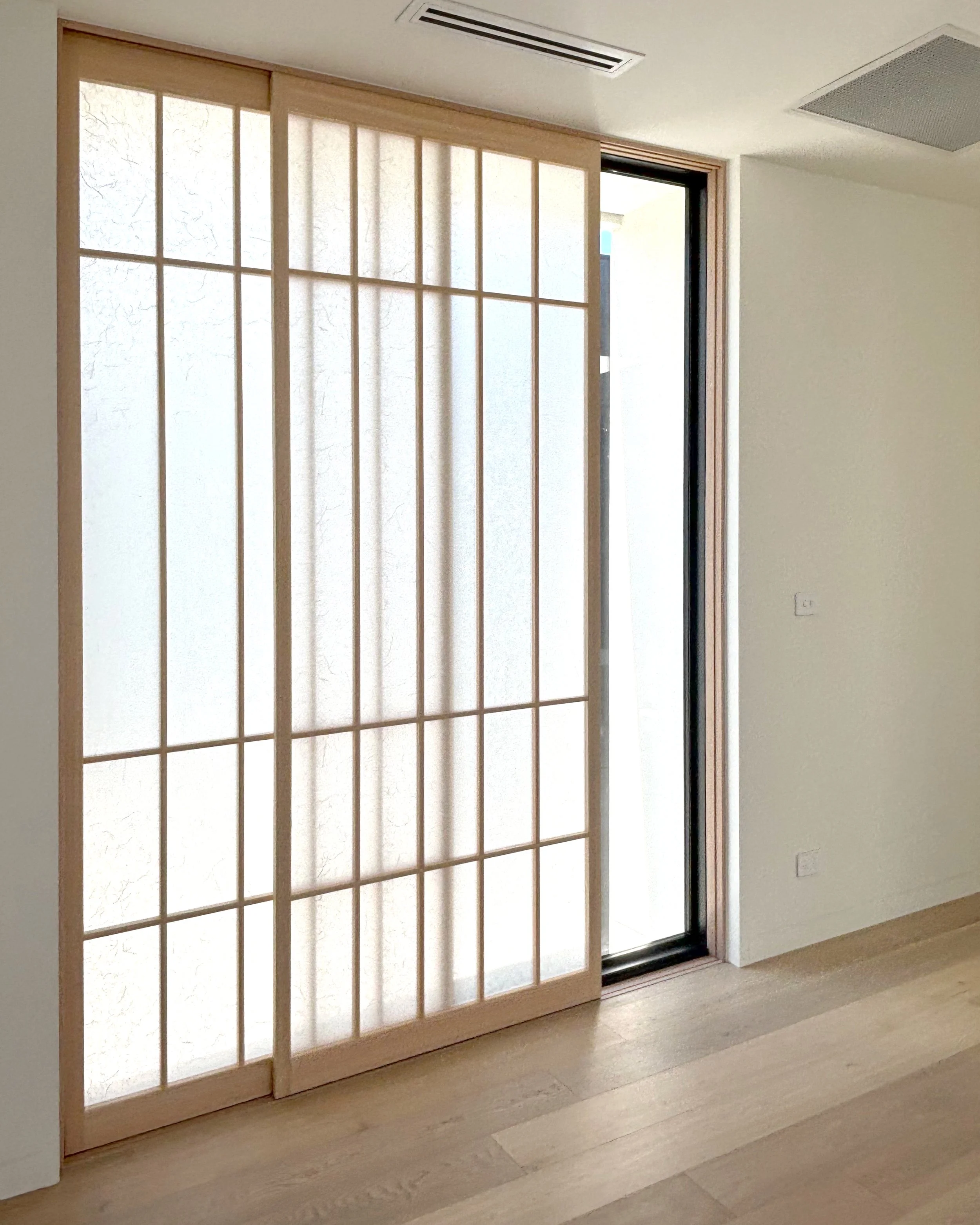 Sliding Shoji screen doors with acrylic ‘paper’. These doors were installed against fixed windows in a new build to provide privacy and diffuse light.