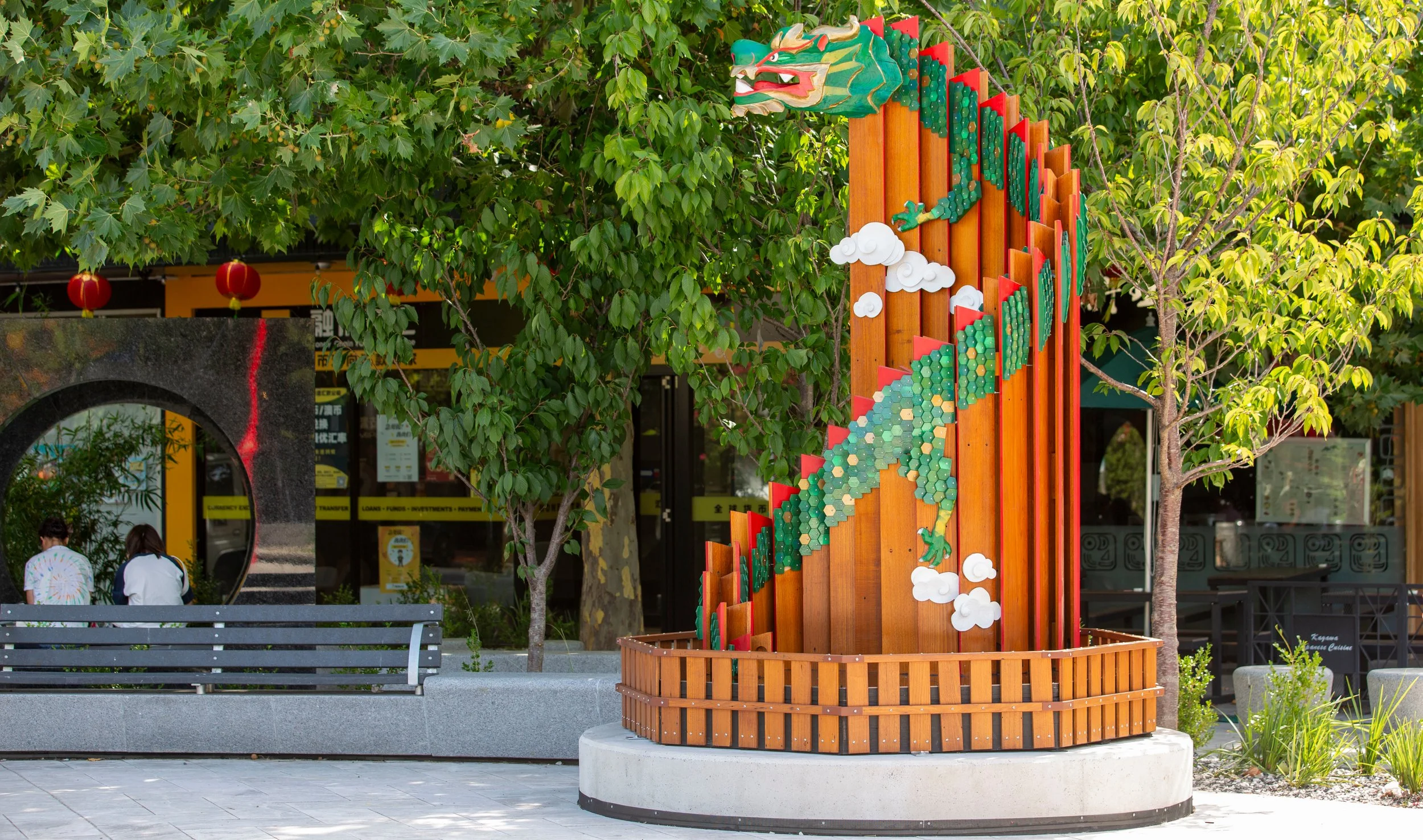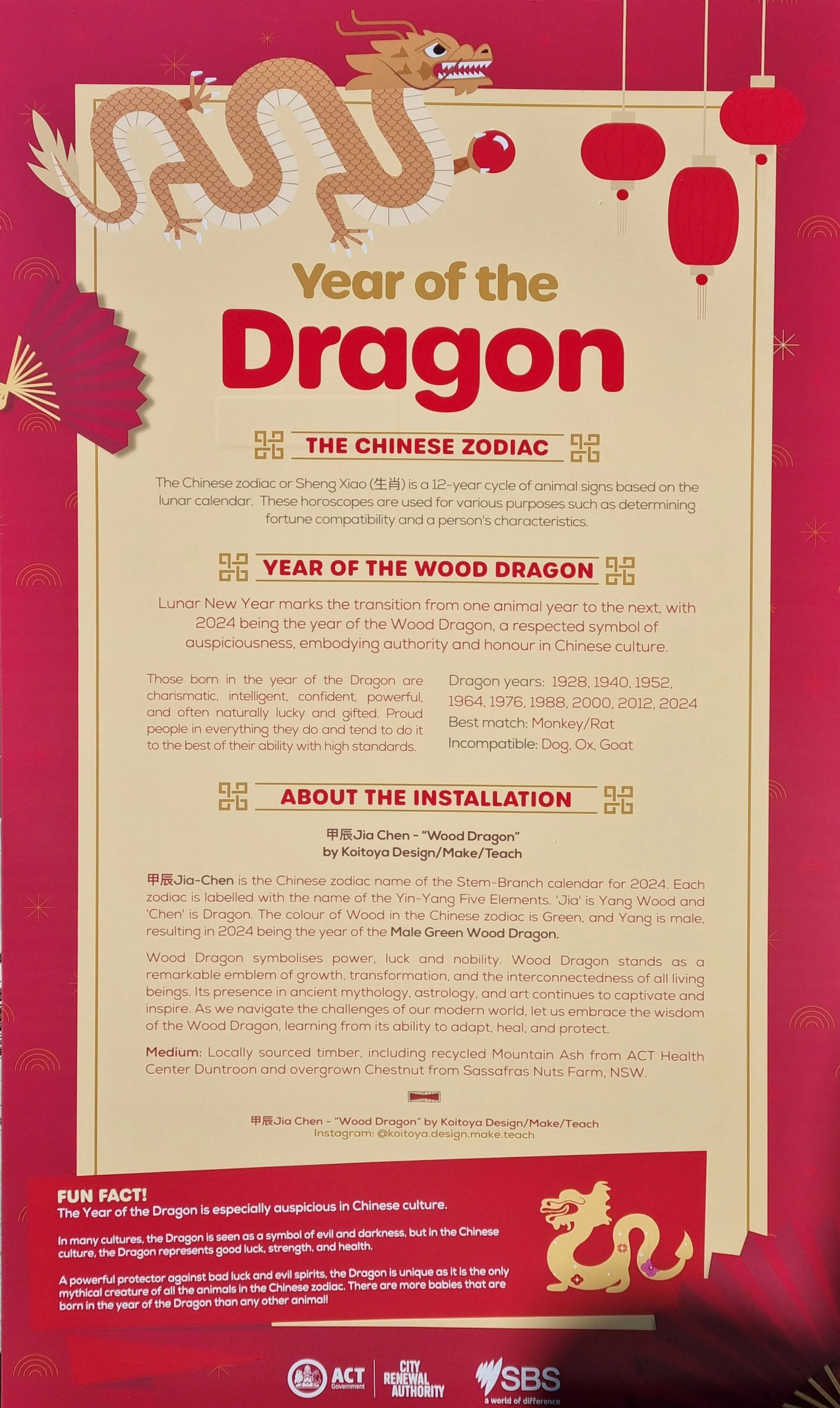 This sculpture was commissioned by the Canberra City Renewal Authority to mark the beginning of the year of the wood dragon. The sculpture was installed in the days before the Lunar New Year festival and was officially unveiled by ACT Chief Minister Andrew Barr.