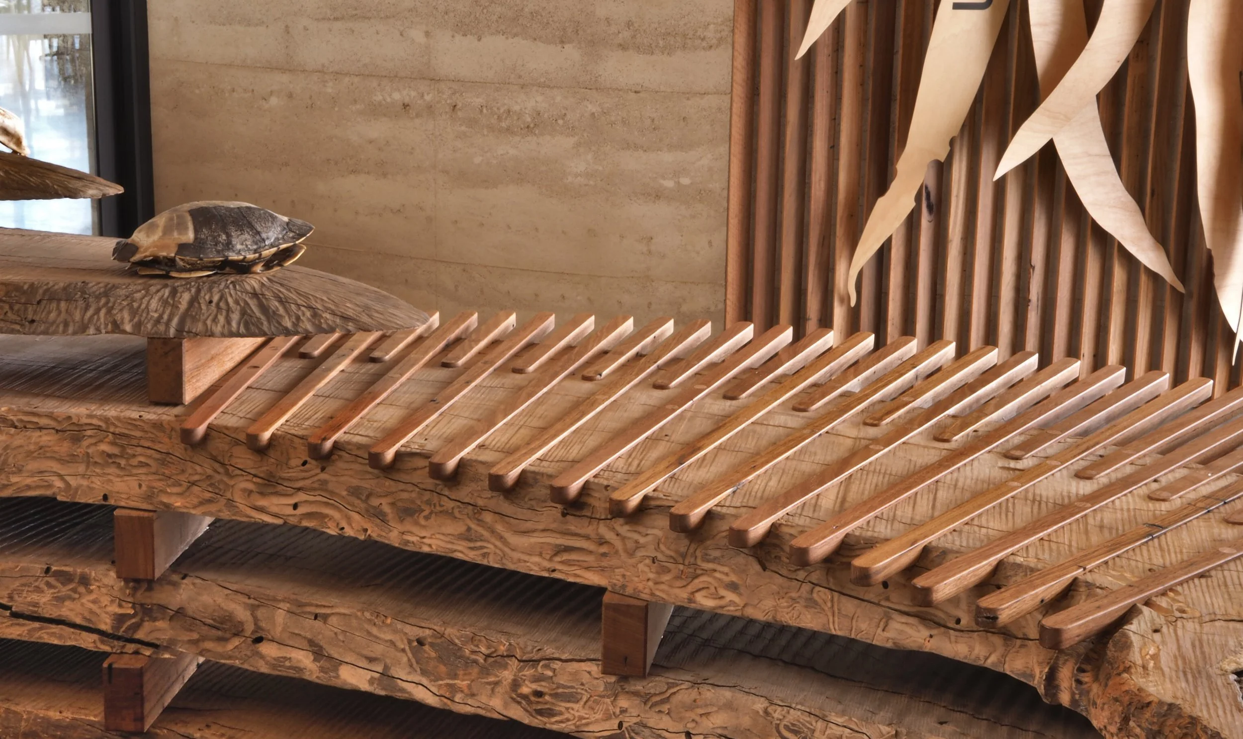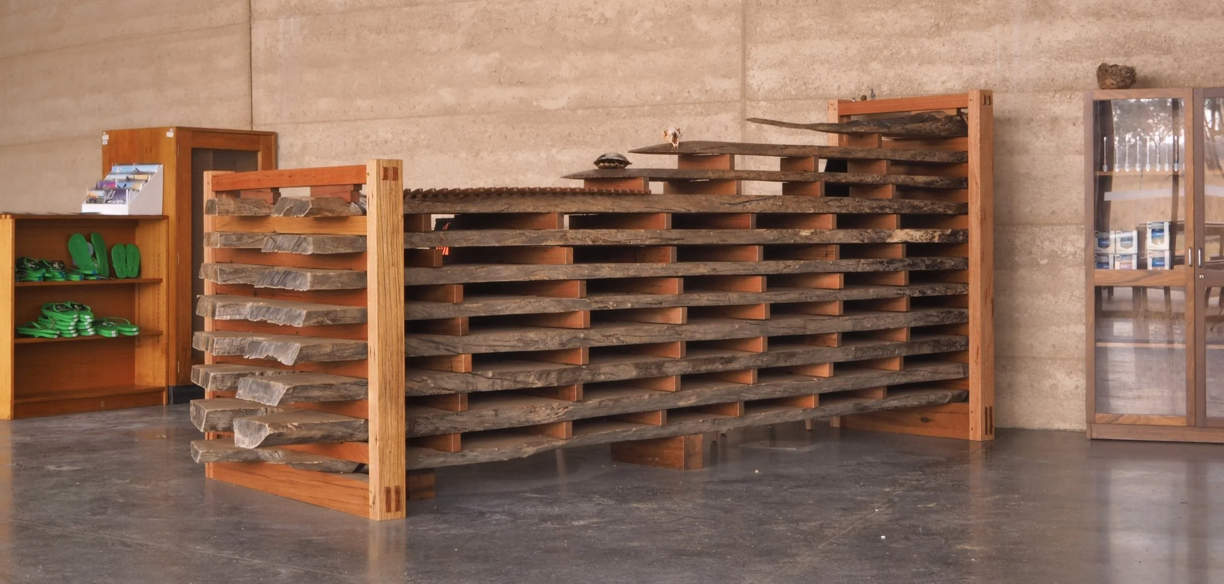 The timber in the reception desk has been stacked in a traditional method that optimises drying while preventing the twisting, cupping and bowing that is a natural outcome of the drying process. The frames at either end are designed to adapt to the shrinking that occurs during drying. Flat surfaces were added to work areas using arrays of recycled timber lengths with the goal of minimising the visual interruption of the natural forms and features beneath.
